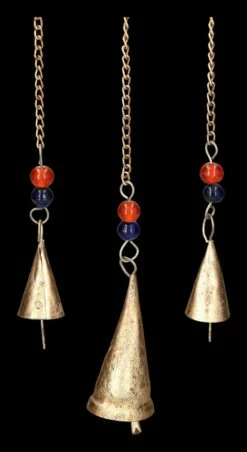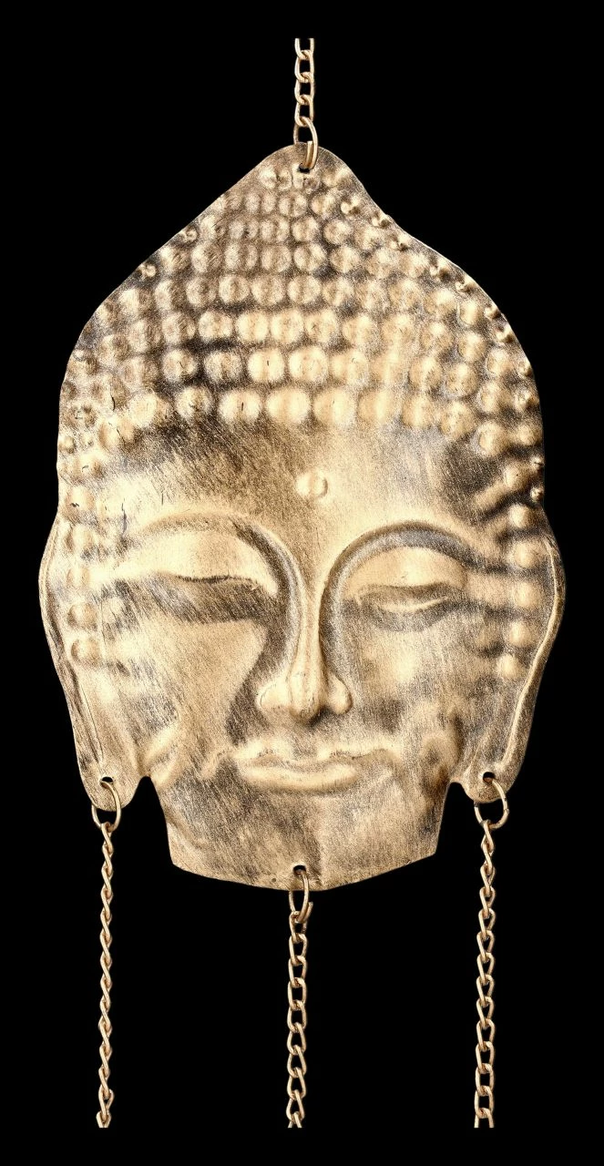 An einem Buddha-Kopf hängen bei dem mit blauen und roten Perlen geschmückten Windspiel drei Glocken, die bei jedem Windhauch zarte Töne erklingen lassen. Das schöne Windspiel mit dem Buddha Kopf und den Glocken ist 63 cm hoch, 11 cm breit und 3 cm tief. Es ist aus Messing gefertigt. Besonders in einem Raum der Ruhe kann das Windspiel mit dem Buddha-Kopf durch die zarten Klänge bei den Yogaübungen begleiten.