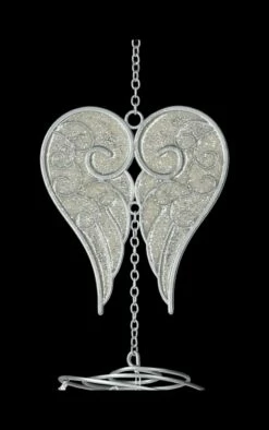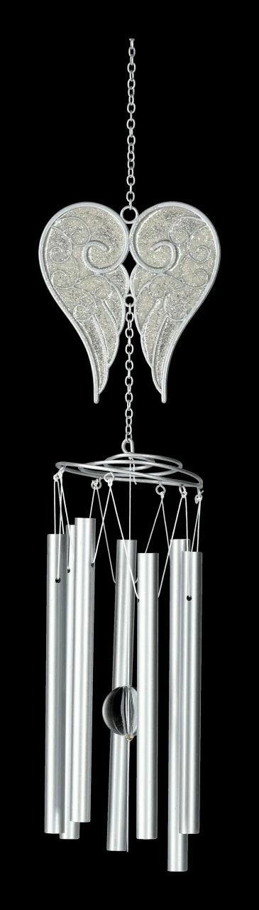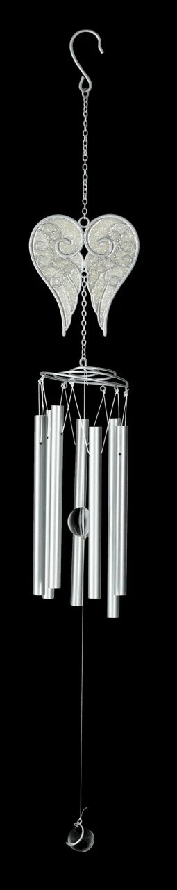 Himmlische Sphärenklänge vermeint man zu hören, wenn der Wind zart durch die 7 Röhrenglocken streicht und die Glaskugel bewegt. Das schöne Klangspiel mit den Engelsflügeln ist aus Aluminium und Glas gefertigt. Mit der Gesamthöhe von 72 cm, der Breite und der Tiefe von je 8 cm ist das Windspiel mit den Engeslflügeln in seiner Schlichtheit ein wunderbares Klangspiel für alle Engel-Liebhaber.