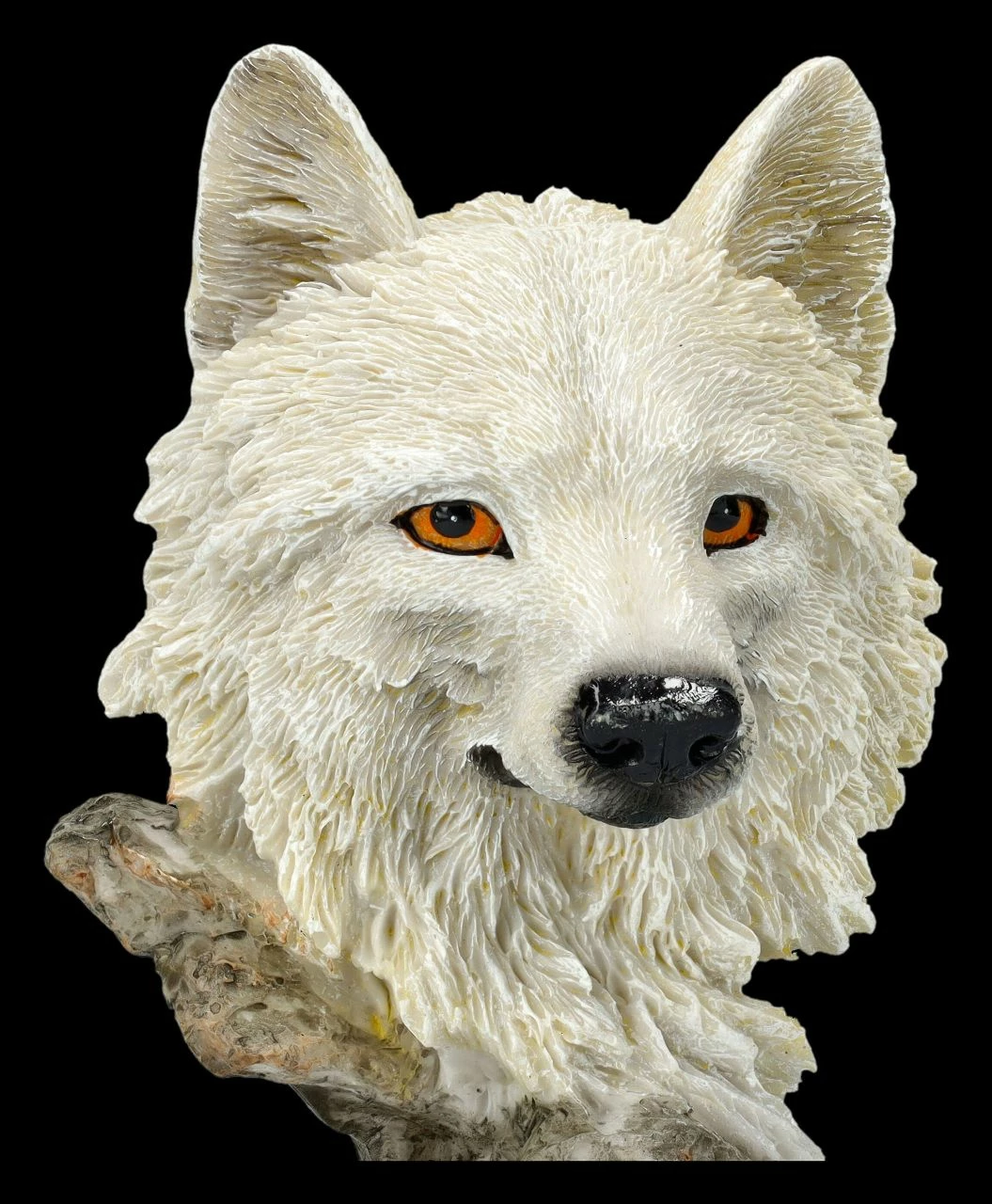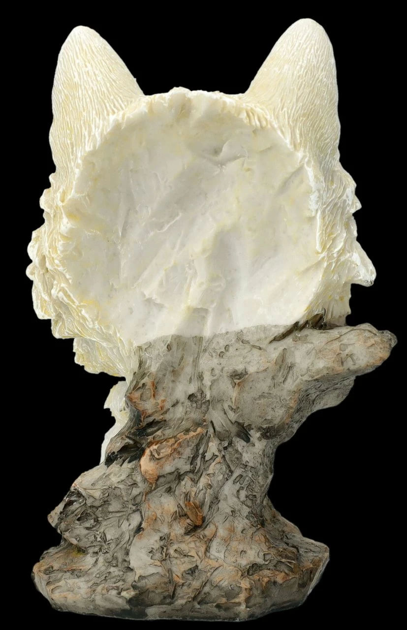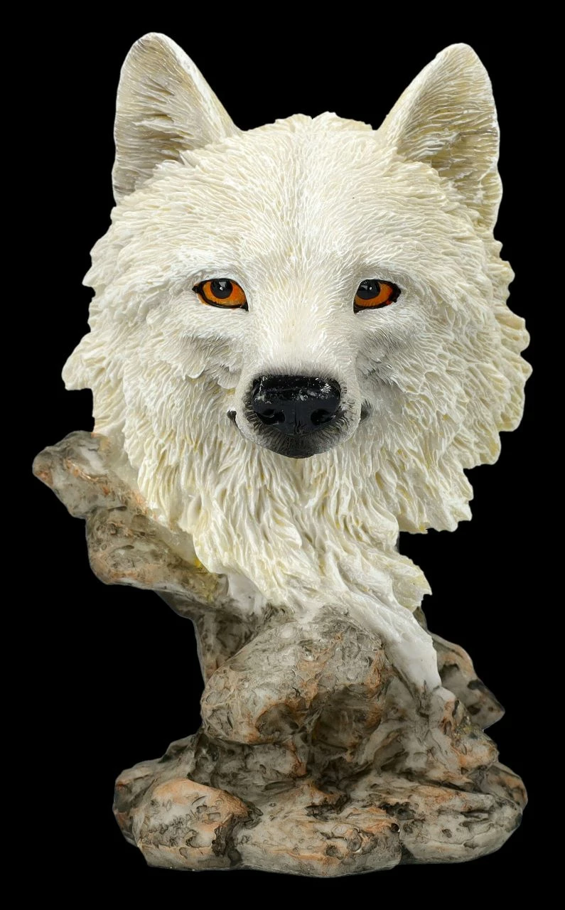 Die kleine Büste mit dem Kopf eines weißen Wolfes mit den aufmerksam blickenden Augen ist eine zauberhafte Dekoration. Die faszinierende kleine Wolf-Skulptur ist aus liebevoll handbemaltem Kunststein (Polyresin). Sie ist 12,5 cm hoch, 8 cm breit und 6 cm tief und ein perfektes Geschenk für alle, die sich über Wölfe in der Natur freuen.