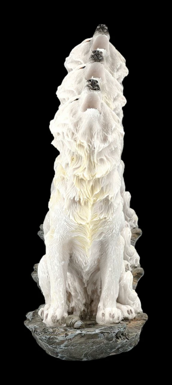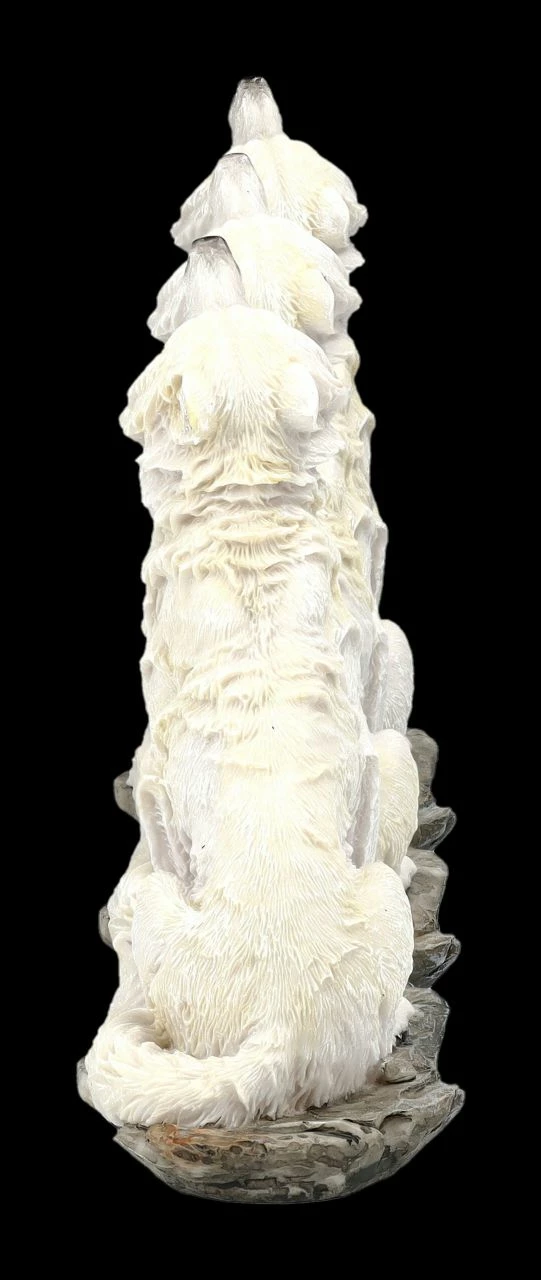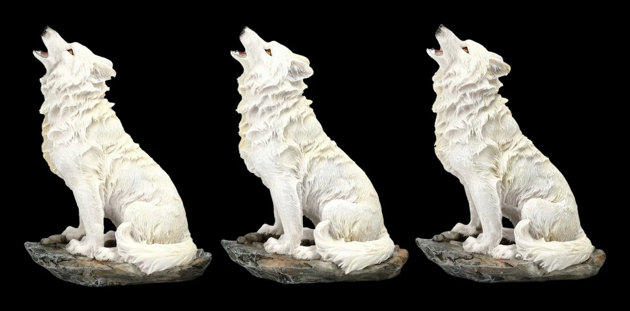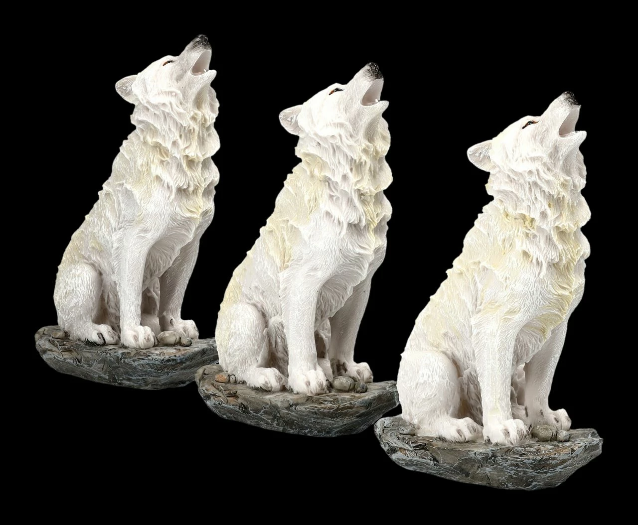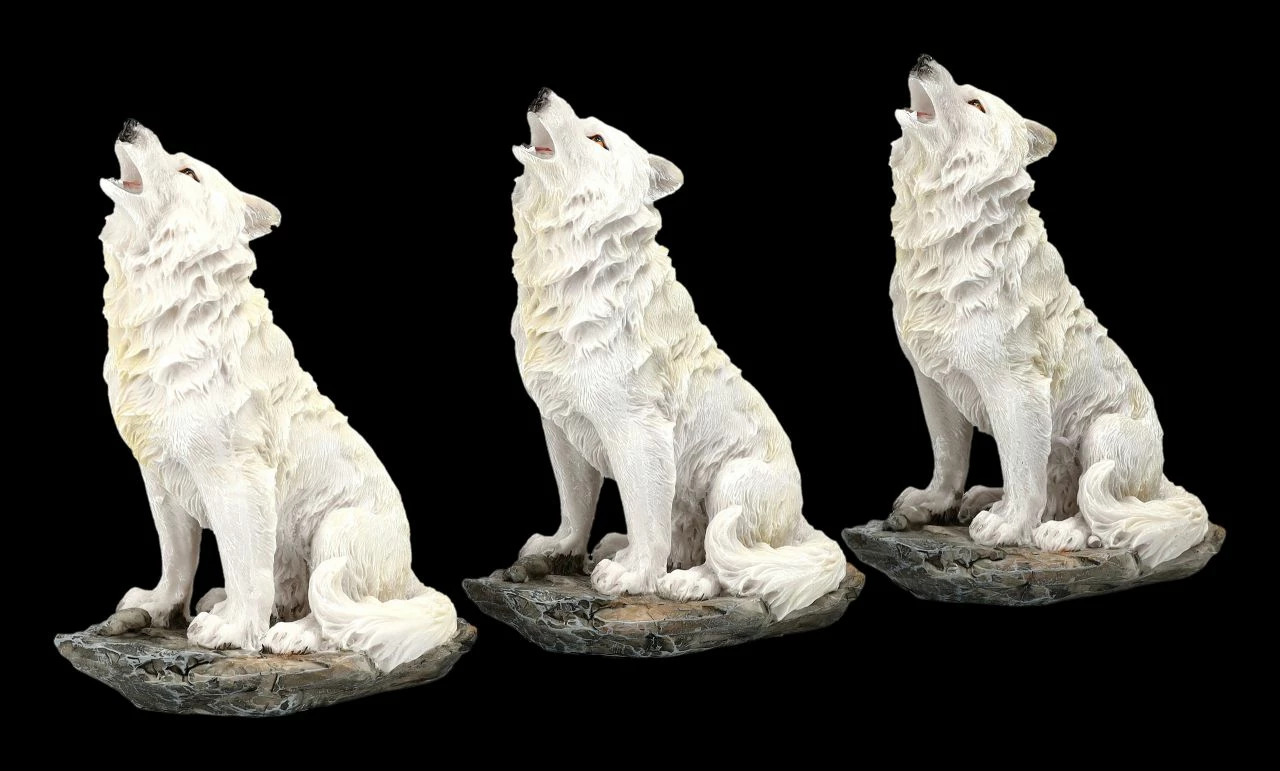 Heulen Wölfe auch in ihrem arktischen Lebensraum den Mond an, oder rufen sie ihre Artgenossen? Jeder Wolfsfreund weiß, dass Wölfe kraftvolle und soziale Tiere sind. Daher sind die drei sitzenden und heulenden weißen Wölfe auch ein tolles Geschenk für jeden, der diese Wildtiere schützen möchte. Die drei je 15 cm hohen, je 6,5 cm breiten und je 10,5 cm tiefen weißen Wölfe wurden detailreich aus handbemaltem Kunststein (Polyresin) gefertigt. Ein fantastisches 3er Set, das man sich auch mit seinen Wolfsfreunden teilen kann. Viele weitere faszinierende Wolfsfiguren findet ihr in unserem Shop.