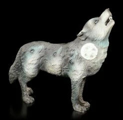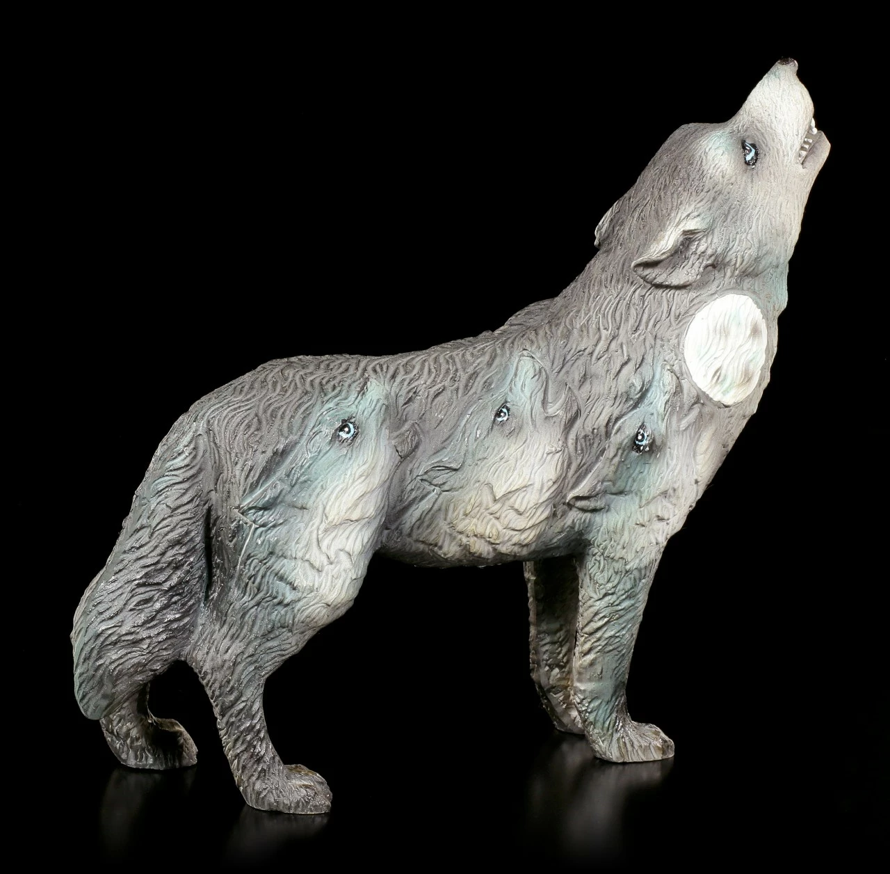Fantasievoll bemalte heulende Spirit Wolfs Figur aus Kunststein. Die drei Wolfsköpfe und der Mond fügen sich wunderbar in das Fell des Wolfes.