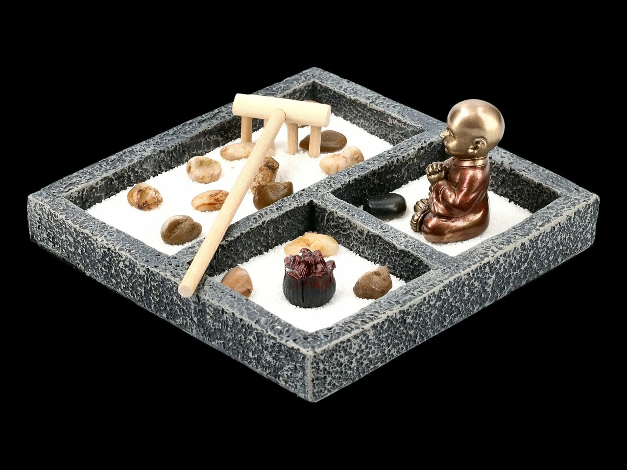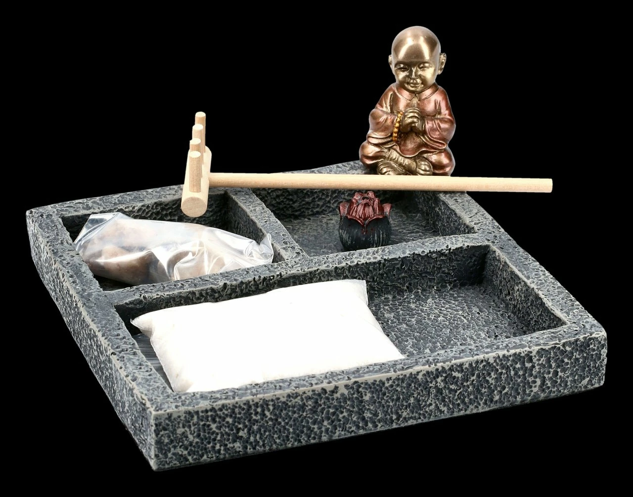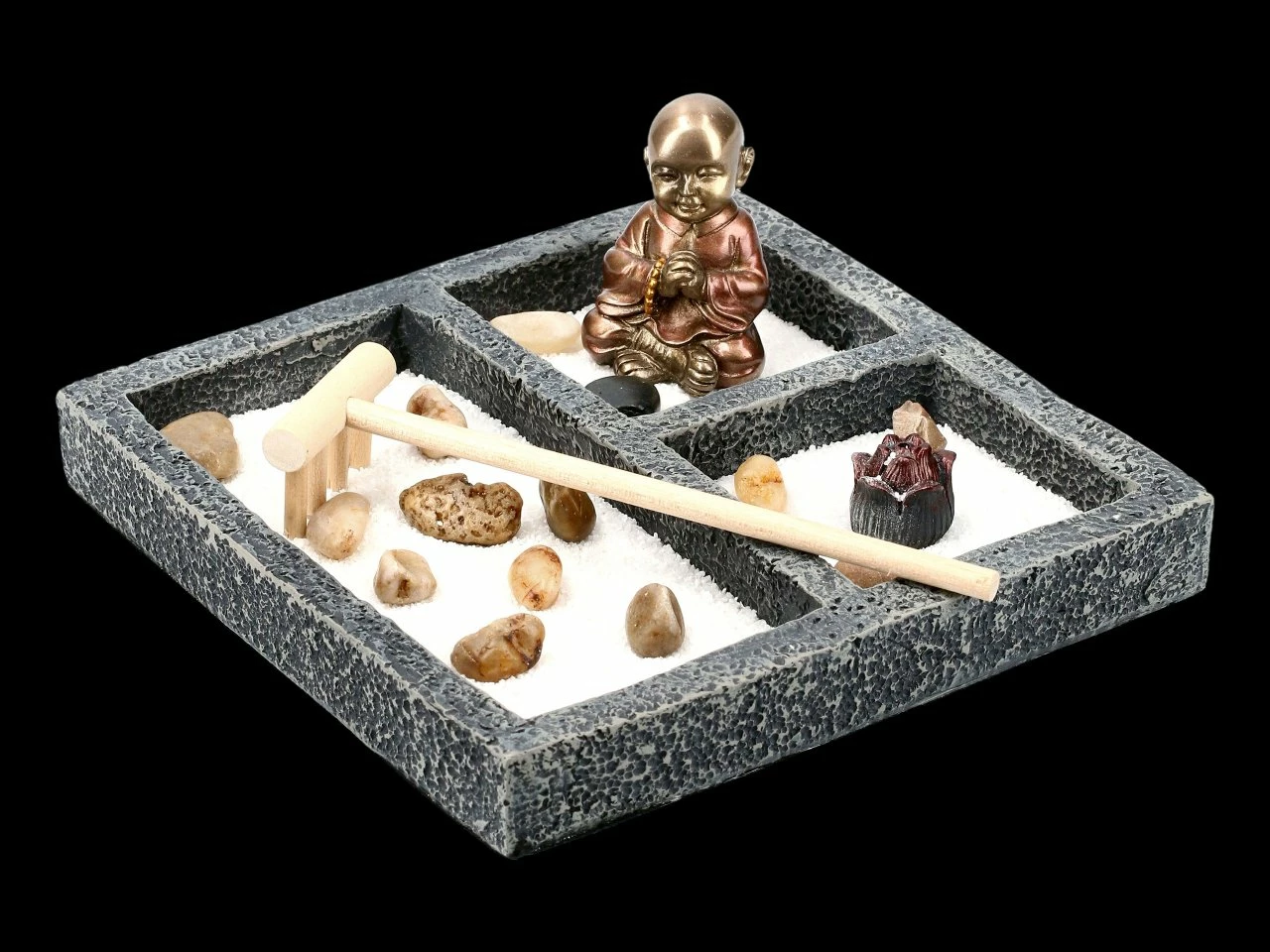 Ein Zen Garten auf dem Tisch oder der Anrichte ist nicht nur eine wunderschöne Deko, sondern beruhigt auch den Geist. Mit dem Rechen den Sand formen und das Anordnen der Steine hat eine meditative Auswirkung auf den Menschen. Der kleine handbemalte Mönch aus Kunststein (Polyresin) ist eine wundervolle Ergänzung zu dem Set.