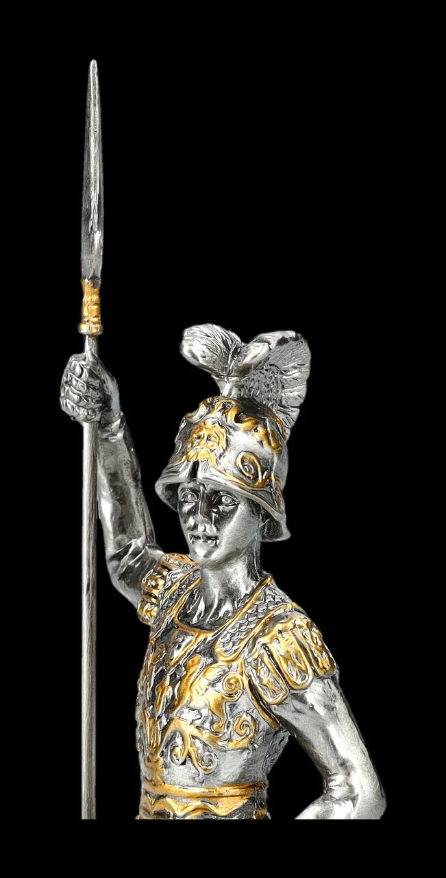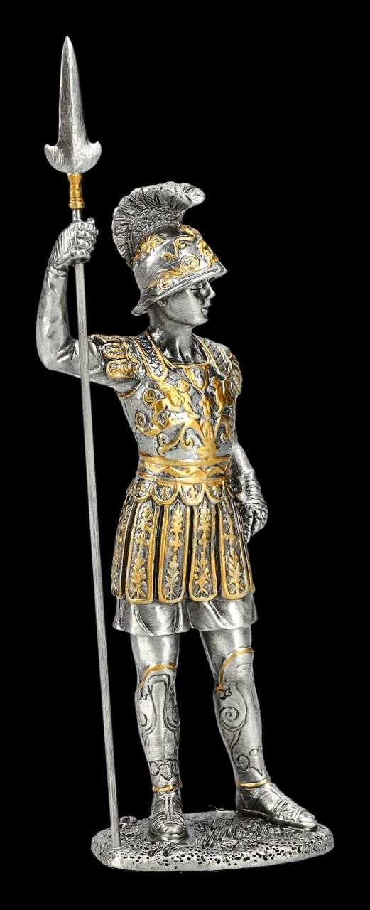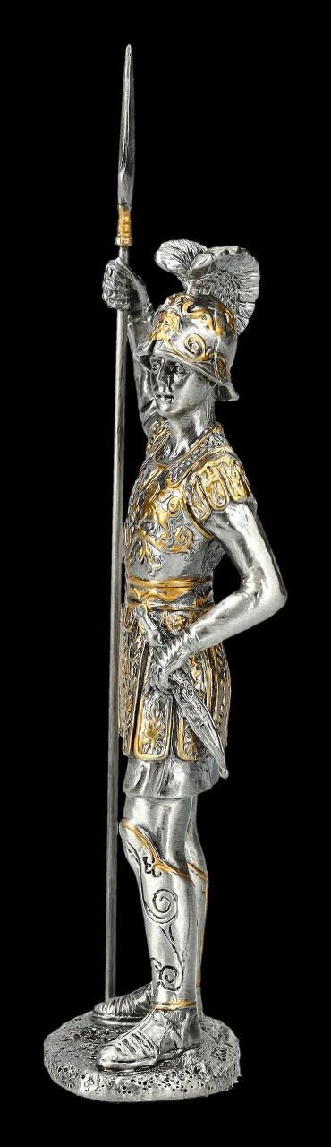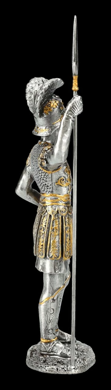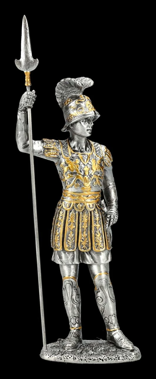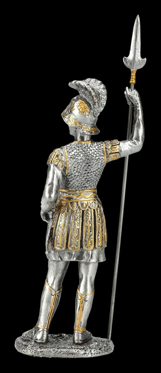 Fein herausgeputzt und die Lanze locker neben seinem rechten Fuß abgestellt, steht der römische Soldat auf den Pflastersteinen. Seine prächtige Kleidung zeigt, dass er offenbar zur Elite der Wächter gehört. Er scheint dazu abgestellt zu sein, vor den privaten Räumen der Damen im Palast des Cäsars zu wachen. Der detailreich aus Zinn gefertigte und sorgfältig von Hand bemalte Römische Soldat stammt aus der Historical Knights Collection von Veronese. Die detailreichen Verzierungen und die goldenen Akzente geben der 14 cm hohen, 5 cm breiten und 3 cm tiefen Zinn-Figur eines Römischen Soldaten ein ausgesprochen edles Aussehen. Der Römische Soldat ist ein perfektes Geschenk für jeden Sammler und eine wunderbare Ergänzung jeder Zinnfiguren-Sammlung.