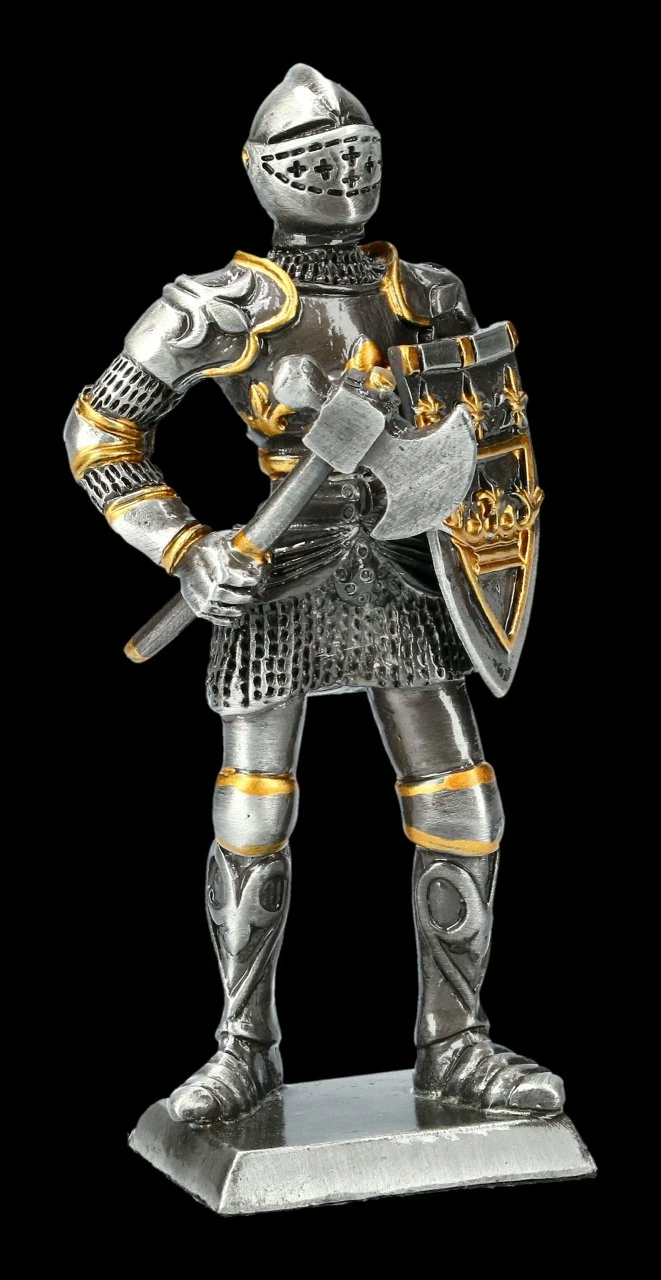 Der effektvolle, mit einer Axt bewaffnete Ritter mit dem detailreichen Schild ist sehr schön und hochwertig aus Zinn hergestellt und edel in Silber mit goldenen Akzenten handbemalt. Die tolle Ritterfigur aus der Summit Collection ist vollplastisch und hat eine Höhe von 10 cm, eine Breite von 4 cm und eine Tiefe von 3,5 cm. Der Ritter mit dem Schild und der Axt lässt sich auch sehr gut mit den anderen Zinn Rittern aus der Summit Collection aus unserem Shop gruppieren. Der schöne Deko-Ritter aus Zinn ist auch ein tolles Geschenk für alle Sammler von Ritterfiguren.