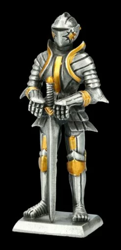 Dieser Ritter aus der Summit Collection ist sehr dekorativ aus hochwertigem und schön handbemaltem Zinn hergestellt. Die Ritterfigur stützt sich auf das Schwert vor sich. Der Zinn Ritter ist vollplastisch und hat eine Höhe von 10,5 cm, eine Breite von 4,5 cm und eine Tiefe von 3 cm. Die Ritterfigur lässt sich auch sehr gut mit den anderen Zinn Rittern aus der Summit Collection aus unserem Shop gruppieren. Der Ritter mit dem Schwert ist aber auch ein tolles Geschenk für Sammler von Ritterfiguren.