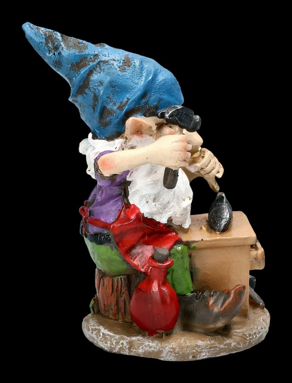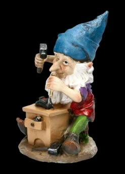 Das ist doch mal eine tolle Abwechslung! Statt derber Arbeits- und Bergschuhe einmal ein feines Paar Damenschühchen unter dem Hammer zu haben. Das zufriedene Grinsen kann nur so gedeutet werden. Bis zum Nagel und Hammer ist diese lustige Zwergenfigur aus liebevoll und detailreich handbemaltem Kunststein (Polyresin) gefertigt. Der Zwerg ist 10,5 cm hoch, 7,5 cm breit und 7,0 cm tief und freut sich auf weitere Zwergendamen, die ihm ihre Schuhe anvertrauen.